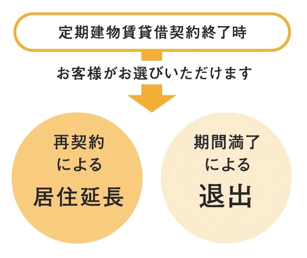 定期建物賃貸借契約終了後は「再契約による居住延長」「再売買による居住」「退出」という3つの選択肢から借主様(元所有者)が自由にお選びいただけます。